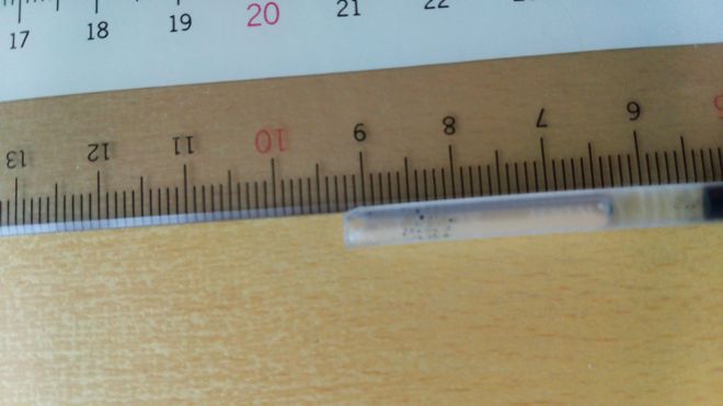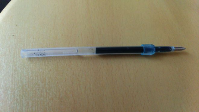 カット後の状態。上記画像は使用中のものなのでインクが減っているが、新品の状態だと替え芯のお尻部分にある透明の油?が充填されている途中でカットすることになる。使用上は問題ない。