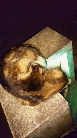 私はオートミールとプロテインを混ぜたものを食べていたのですが、少しだけ猫に分けてあげました。ところが、クンクンと匂いチェックをした後に甘い味のするプロテインだけ舐めて、オートミールは食べませんでした。おそらく、誰かがエサを与えているのでしょう。味にはうるさいようです。